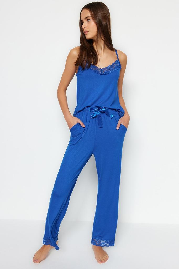 Women's Fashion Blue Lace and Ribbon Bow Detailed Viscose Knitted Pajama Set with Rope Strap