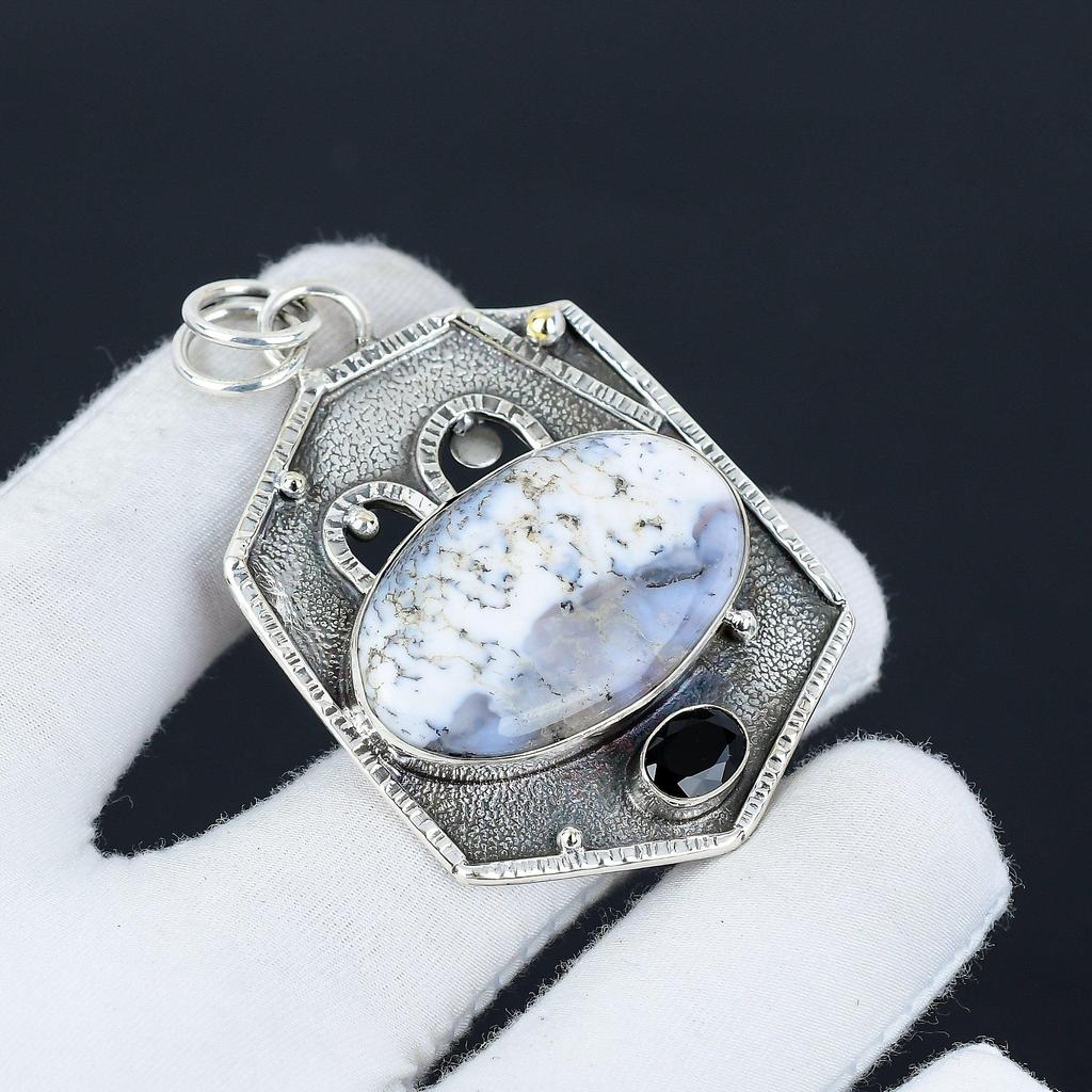 Dendritenopal, Edelsteinanhänger mit schwarzem Spinell, Natürlicher Dendritenopal-Edelstein, Handgefertigt aus 925er Sterlingsilber, Dendritenopal-Anhänger für Frauen, Anhänger zum Verschenken