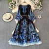 Herbst Plissee Wunderschöne Blume Drucken Urlaub Maxi Kleid Frauen Runde Kragen Laterne Ärmel Hohe Stretch Gürtel Lange Kleidung
