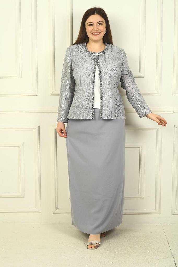 Kadın Pulpayet Ceket Yarım Ay Kollu Bluz Astarlı Krep Uzun Etek Büyük Beden 3'lü Takım