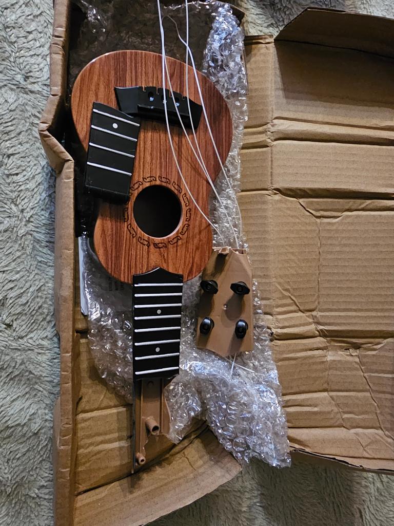 Die Gitarre ist klein, aus Plastik. Die Saiten sind aus Angelschnur.