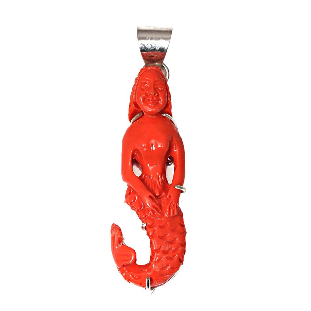 Pendant Red Coral Lady Figher Gemstone Handmade Ethnic Silver Jewelry 2.5"