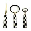 Das verwendete Material ist Messing. Das Finish ist Gold. Aus Messing gefertigt Die Maße des Ständers sind 29,21 cm hoch x 10,16 cm breit Brieföffner 22,86 Flaschenöffner 17,78 cm Lupe 22,86 x 7,62 Handgefertigter Artikel