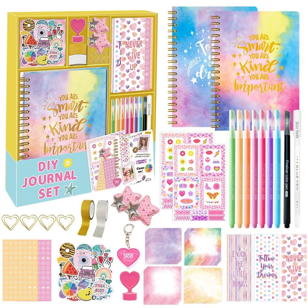 - Das Journal-Set beinhaltet dieses Notizbuch (50 Blatt), 50 Aufkleber, 20 Notizblöcke, 1 Herz, 4 goldene Büroklammern, 2 Bilderrahmenaufkleber, 8 farbige Stifte, 2 Buchstabenaufkleber, 1 Herzanhänger, 1 Klebestift, 2 Rollen Glitzerband, 3 Papierlesezeichen, 2 Sternhaarspangen Dies ist ein komplettes Set für Ihre