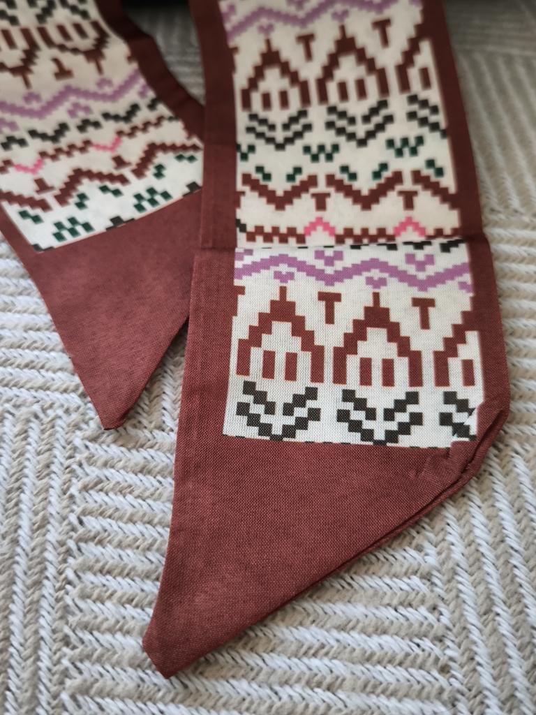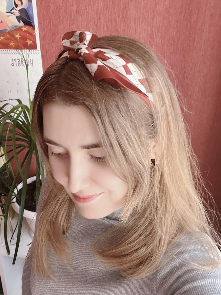 Ein Band, das sich ideal als Schal oder Stirnband eignet ❤️ Material - Polyester. Die Qualität der Schneiderei ist gut. Das Klebeband ist doppelseitig, aber das Muster ist überall gleich. Das Band kam mehrfach gefaltet in einer Tüte an. Es ist besser, es vor dem Gebrauch zu bügeln, da die Falten sichtbar sind.