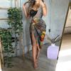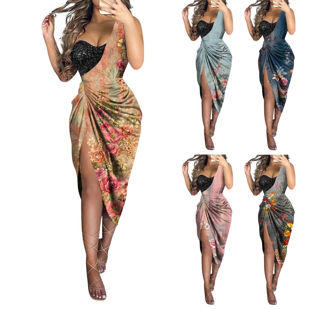 Damen-Abendkleid mit Retro-Print, sexy Pailletten-Schlitz, Maxi-Smocked-One-Shoulder-Abendkleid