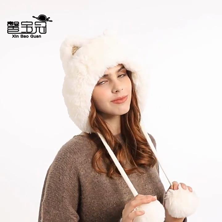 Damen Niedliche Winter Strickmütze mit Cartoon Katzenohren und Bommeln Verdicken Warmes Fleecegefüttertes Ohrschützendes Hut für Frauen