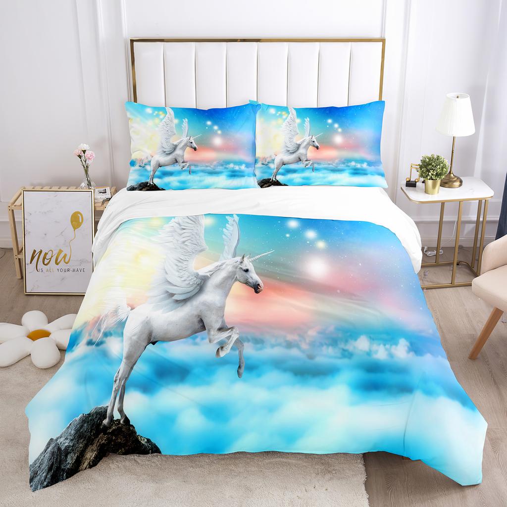 Einhorn-Bettbezug-Set, weißes Pferd mit Flügel, 3D-Druck, Kingsize, Polyester, Bettbezug für Kinder, Bettwäsche-Set mit Kissenbezug