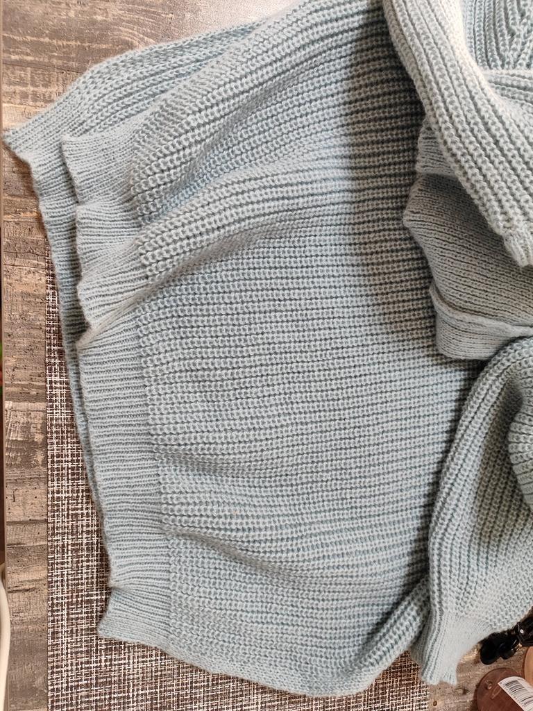 Der Gummizug unten ist oooooober eng, auf dem Foto ist es ein gerader Pullover, aber in Wirklichkeit sind die Schlitze zur Mitte hin zusammengezogen und an den Seiten klaffen Lücken statt Schlitzen 🙆♀️