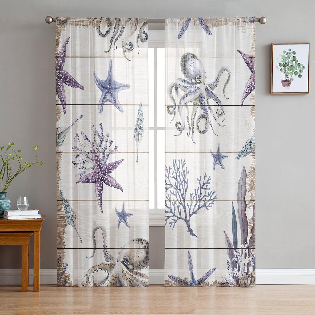 Tüllvorhang mit Meeresmotiven, Aquarell-Kreaturen, Seesterne, Oktopus, Voile, transparent, für Schlafzimmer, Wohnzimmer, durchsichtige Fenstervorhänge