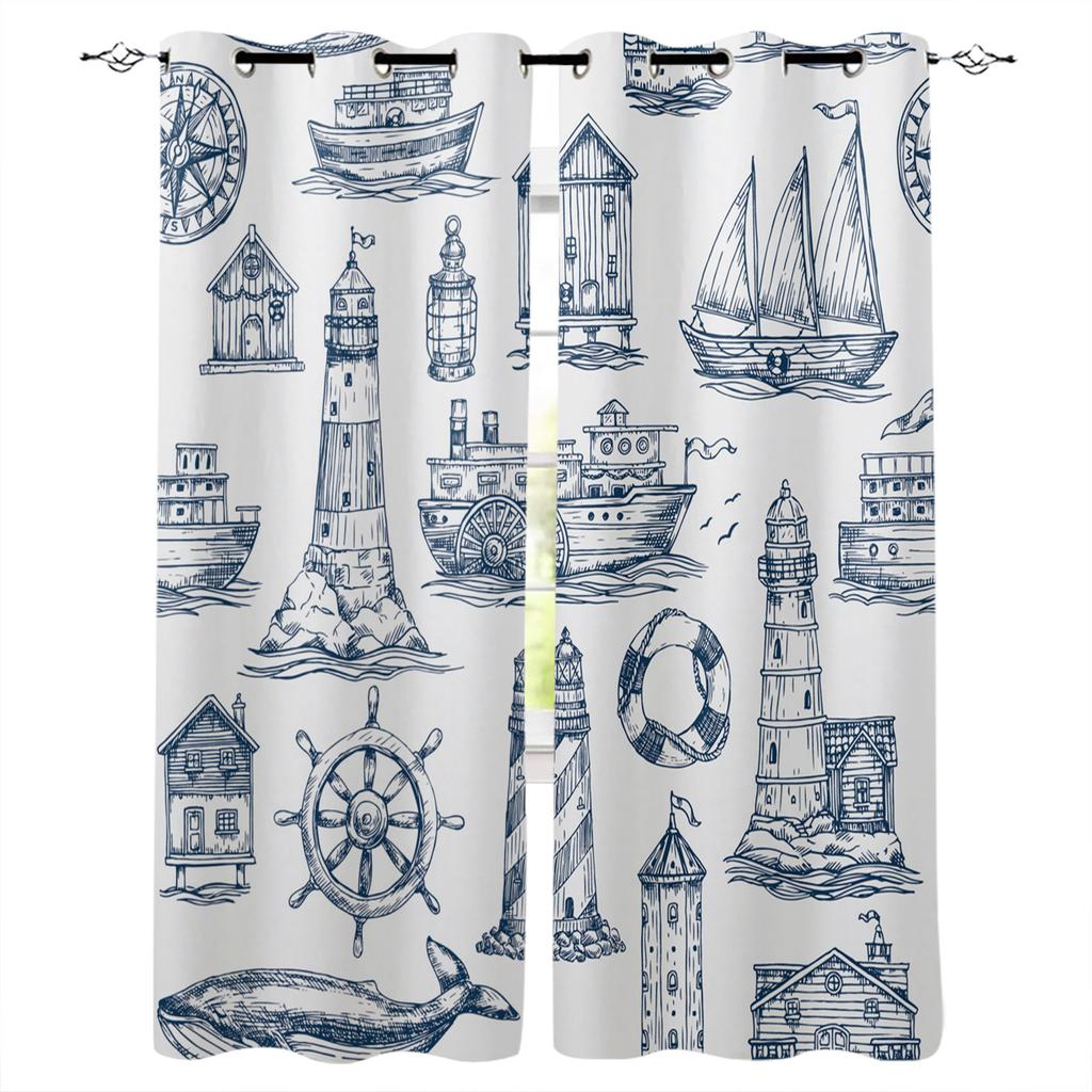 Nautischer Anker Schiff Leuchtturm Wal Kunst Verdunkelungsvorhänge für Wohnzimmer Schlafzimmer Bedruckte Fensterbehandlung Vorhänge Heimdeko