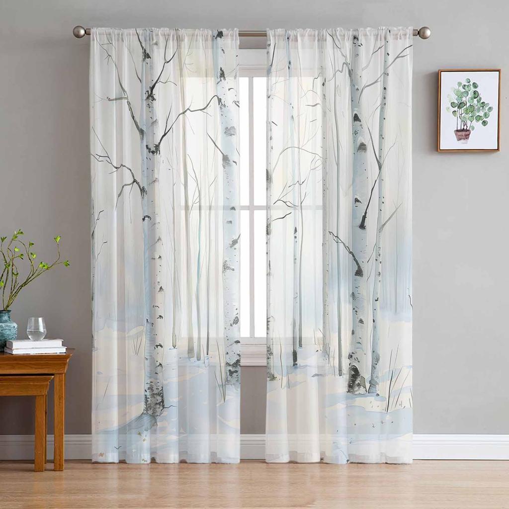 Winter Schneelandschaft Aquarell Birke Transparente Vorhänge Modernes Gazevorhang für Wohnzimmer Schlafzimmer Voile Garn Vorhänge