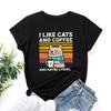 Katzen- & Kaffee-Print Baumwoll-T-Shirts Lässiges Rundhals-Kurzarm-T-Shirt, Damenbekleidung