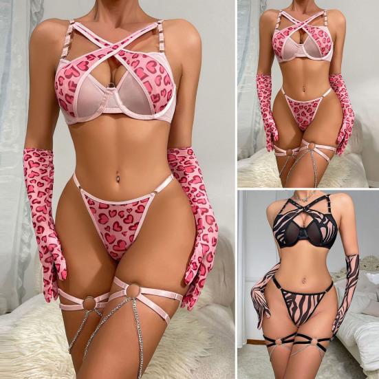 1 Set Damen-Unterwäsche-Set beinhaltet Handschuhe und Oberschenkelringe, String mit Kettendekor und Herz-Print