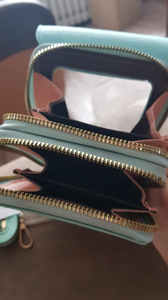 Gute Handtasche. Der Bildschirm des Telefons reagiert. Man kann das Telefon einschalten, ohne es herauszunehmen. Es passen ein kleines Portemonnaie, Schlüssel, Kosmetik hinein. Es gibt Fächer für Karten. Danke.