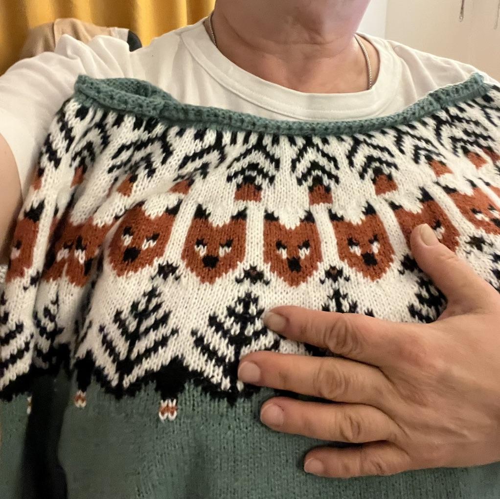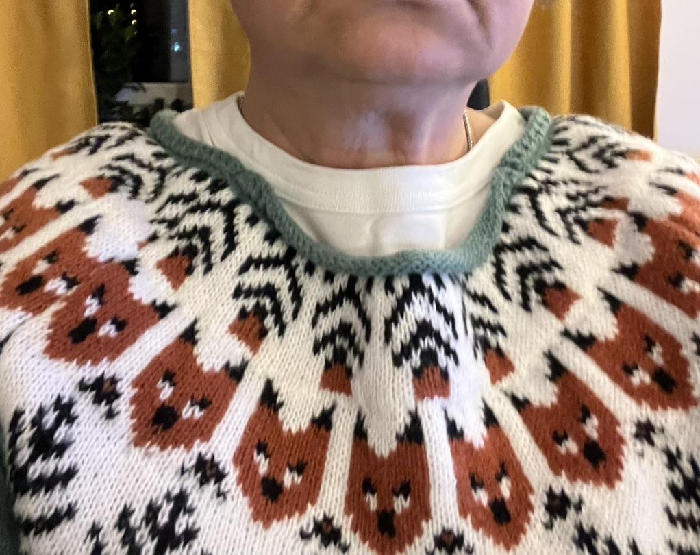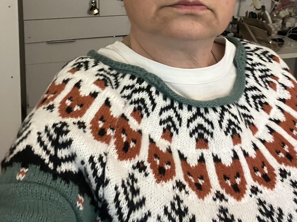 Falsches Schnittmuster, Halsausschnitt falsch gestrickt oder gar nicht fertiggestellt, habe versucht, ihn mit dem Bügeleisen zu dehnen, ist schlecht geworden. SEHR schlecht!!! FALSCHER HALSAUSSCHNITT. am Bauch.