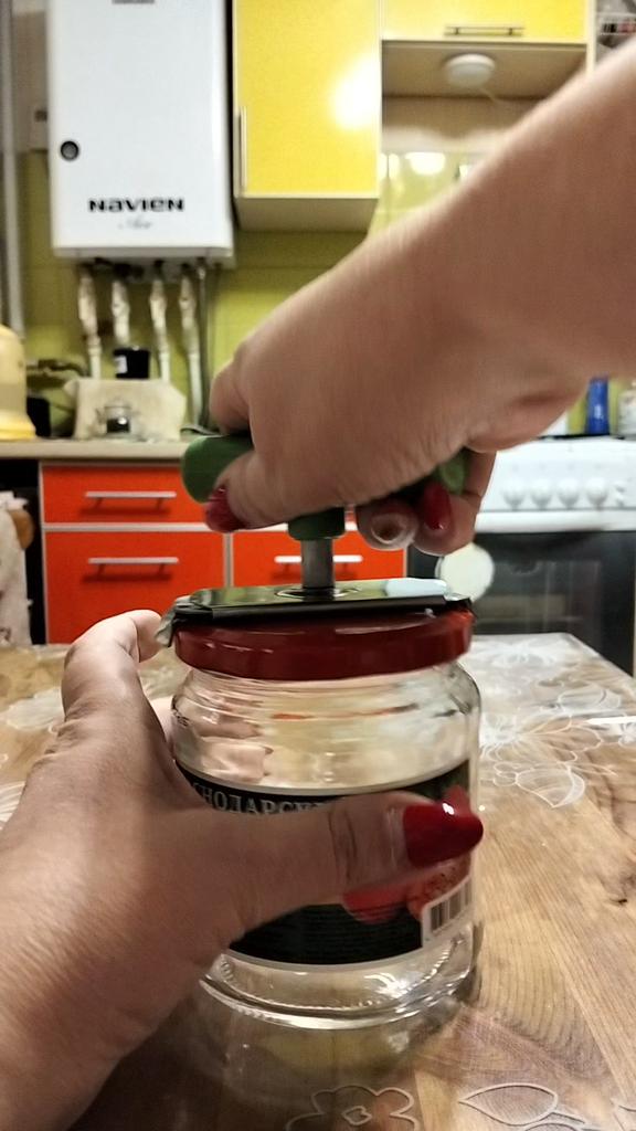 Wie auf dem Foto. Die Konstruktion ist so lala, aber sie öffnet Dosen. PS: Gekaufte Gläser habe ich geöffnet. Die hausgemachte Einmachkost habe ich nicht geschafft.