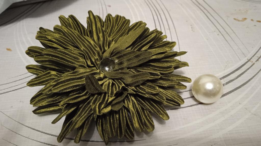 Ich hätte nicht erwartet, dass diese Dekoration so schön aussieht. Die graue Farbe des gewellten Stoffes mit silbrigem Schimmer, aus dem diese Chrysantheme gefertigt ist, erweckt den Eindruck eines „Haute Couture“-Dekors. Ich bin sehr zufrieden..
