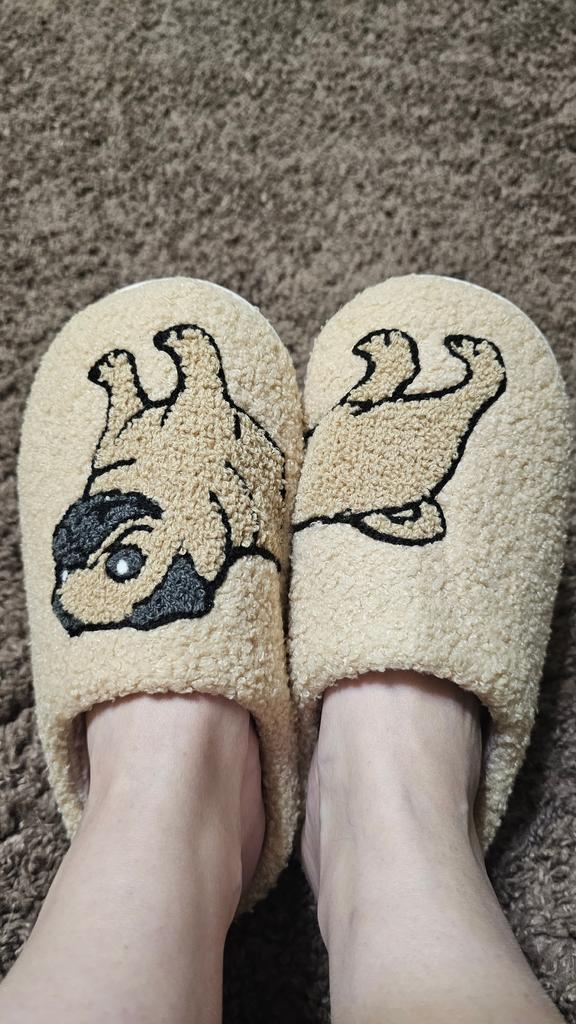 Lässige Hausschuhe mit Cartoon-Mops, gemütliche, warme Hausschuhe aus Baumwollplüsch mit weichem Stoff, Ganzjahres-Schlupfschuhe, Positionierungsdrucktechnologie