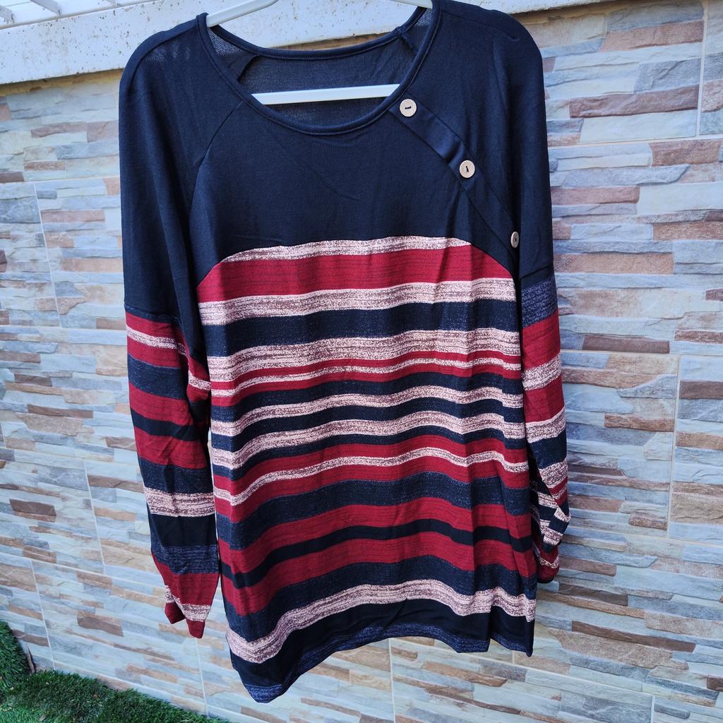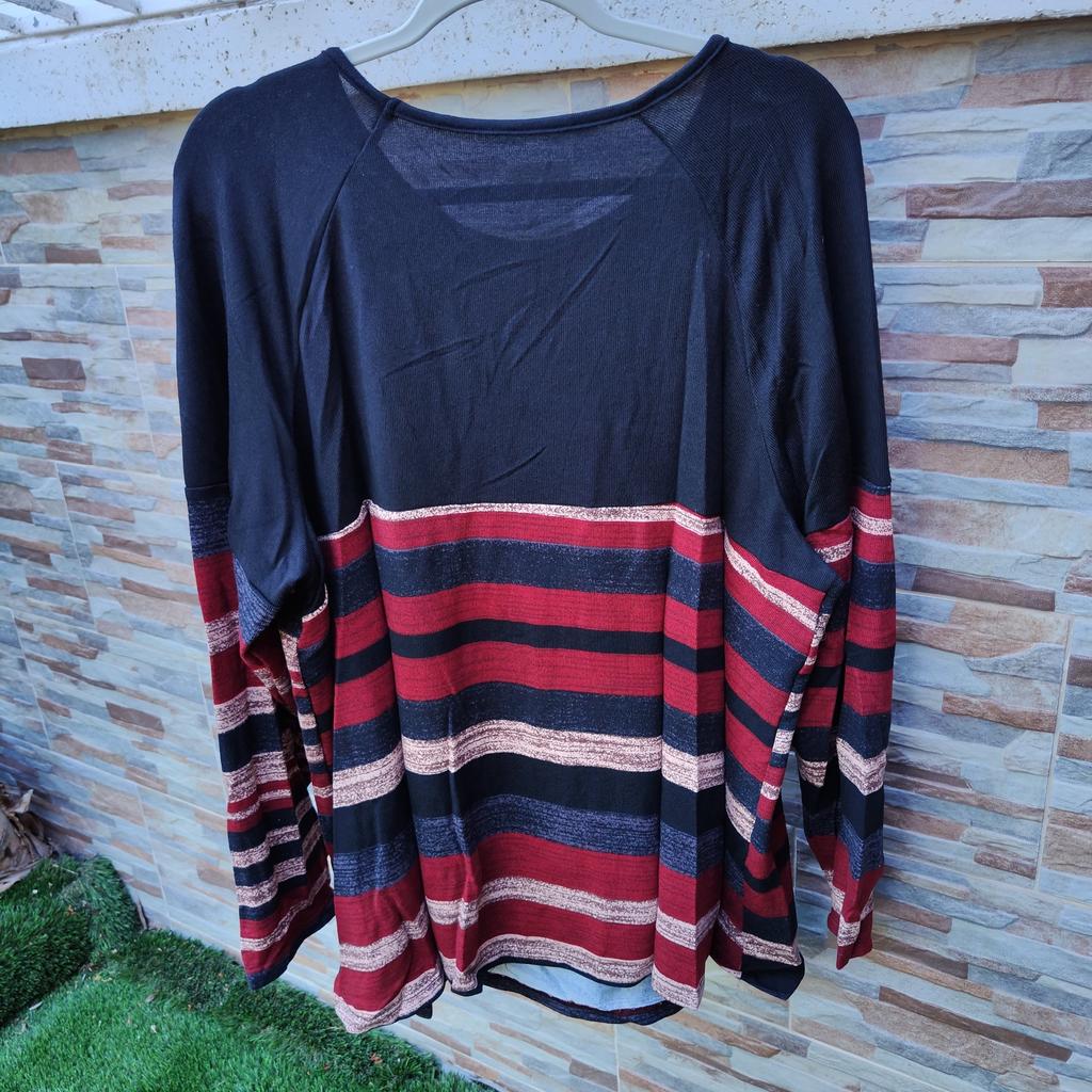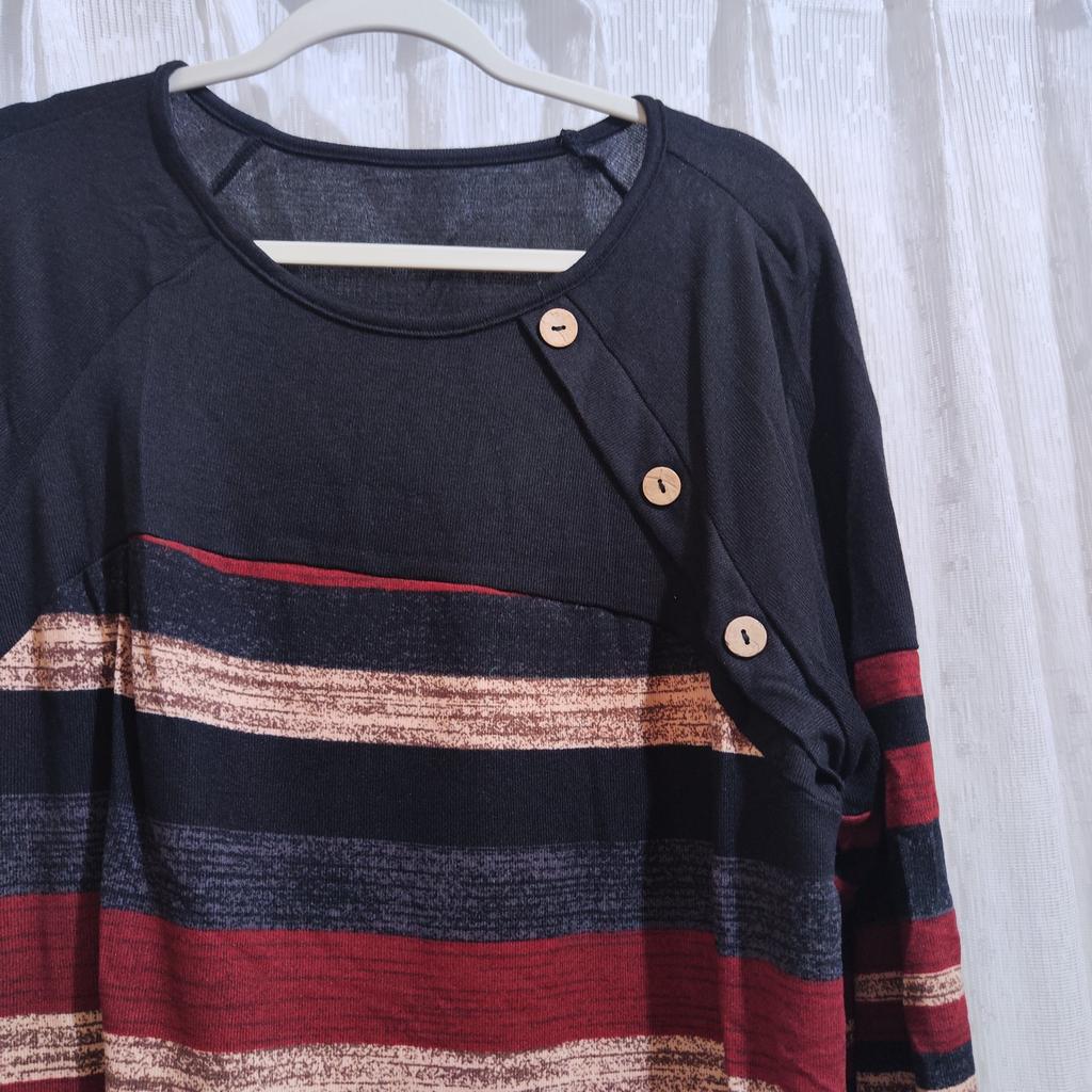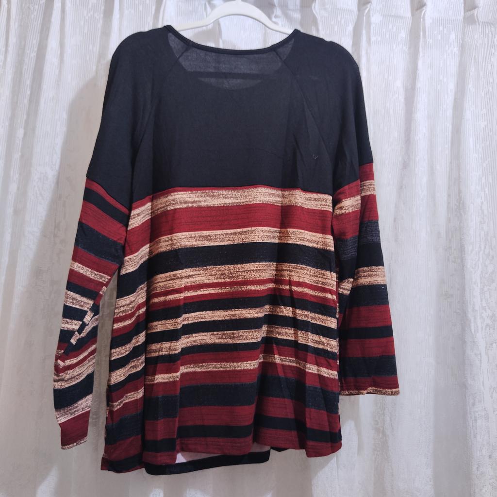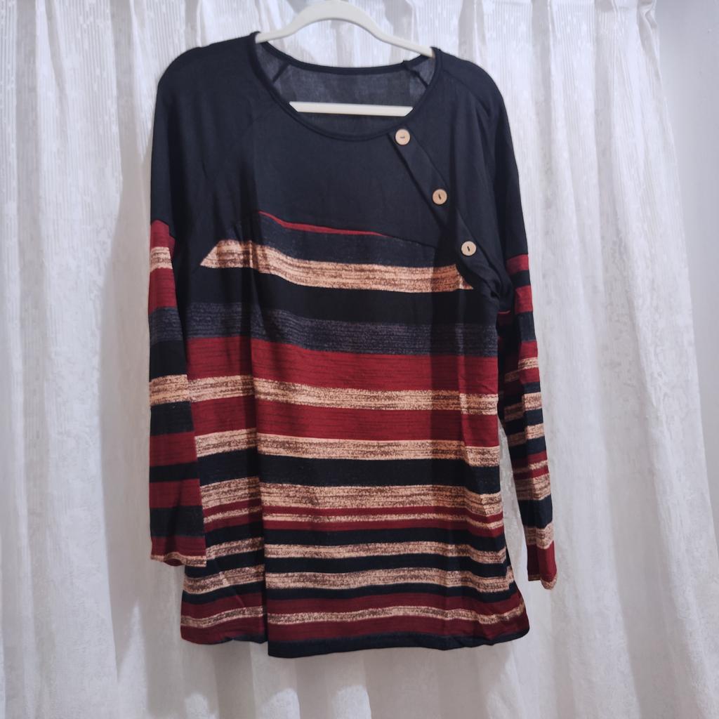 Dieser Top ist einfach bequem und schmeichelhaft! Stoff, der sich angenehm anfühlt, ausreichend flexibel, nicht zu eng anliegend – sitzt genau richtig am Körper. Besonders gefallen hat mir das weite Design und die Streifen, die einen etwas schicken und etwas lässigen Look verleihen, wirklich passend für den Alltag oder sogar für den Abend mit Jeans und schönen Schuhen.. Der Rundhalsausschnitt ist klassisch, und die langen Ärmel passen genau zu dieser Jahreszeit. Da es locker geschnitten ist, schmeichelt es auch großen Größen, ohne wie ein "Sack" auszusehen, sondern genau im richtigen Gleichgewicht.. Die Farbe Schwarz mit den geometrischen Streifen macht wirklich was her, und die kleinen Flicken verleihen einen interessanten Touch. Handwäsche hält ihn hervorragend in Form – er ist weder eingelaufen noch hat er Farbe verloren.. Ich empfehle es jeder, die ein alltägliches Kleidungsstück mit etwas Stil sucht, ohne sich anzustrengen. Es lohnt sich auf jeden Fall.