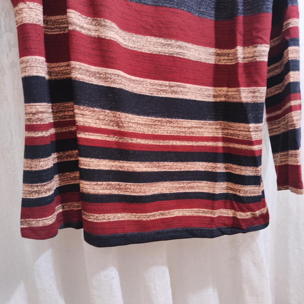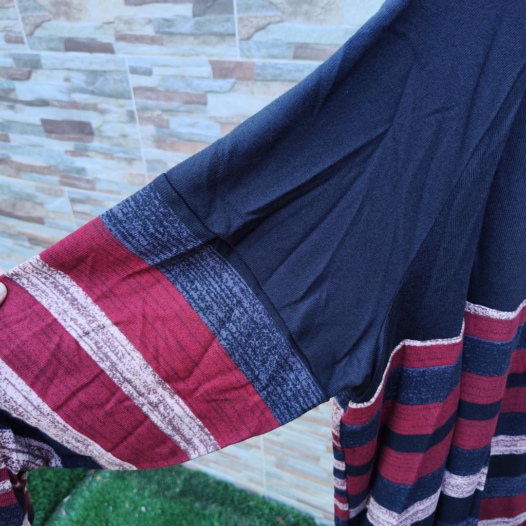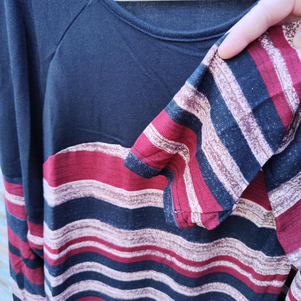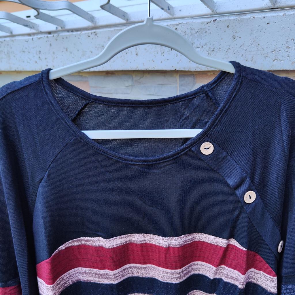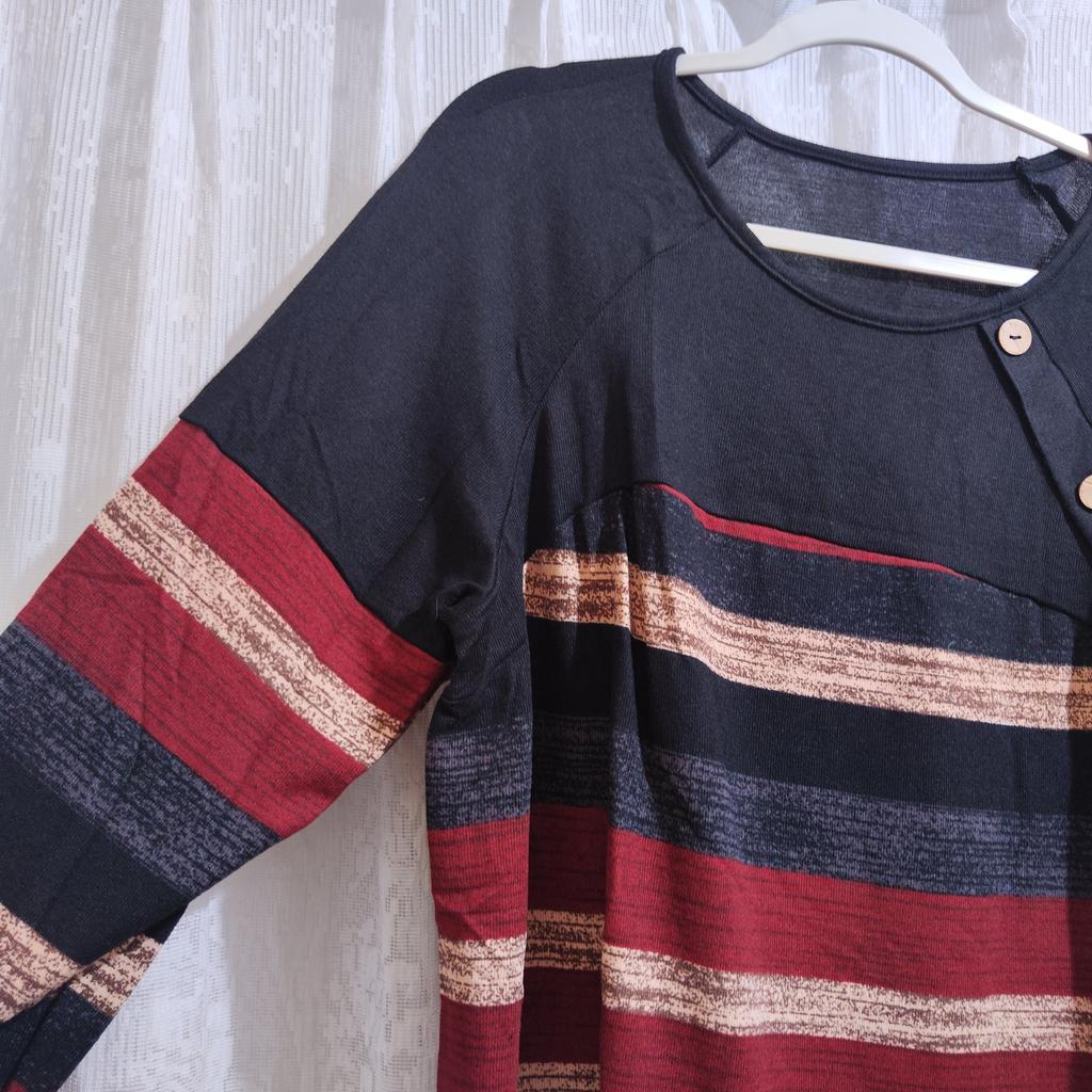 Dieser Top ist einfach bequem und schmeichelhaft! Stoff, der sich angenehm anfühlt, ausreichend flexibel, nicht zu eng anliegend – sitzt genau richtig am Körper. Besonders gefallen hat mir das weite Design und die Streifen, die einen etwas schicken und etwas lässigen Look verleihen, wirklich passend für den Alltag oder sogar für den Abend mit Jeans und schönen Schuhen.. Der Rundhalsausschnitt ist klassisch, und die langen Ärmel passen genau zu dieser Jahreszeit. Da es locker geschnitten ist, schmeichelt es auch großen Größen, ohne wie ein "Sack" auszusehen, sondern genau im richtigen Gleichgewicht.. Die Farbe Schwarz mit den geometrischen Streifen macht wirklich was her, und die kleinen Flicken verleihen einen interessanten Touch. Handwäsche hält ihn hervorragend in Form – er ist weder eingelaufen noch hat er Farbe verloren.. Ich empfehle es jeder, die ein alltägliches Kleidungsstück mit etwas Stil sucht, ohne sich anzustrengen. Es lohnt sich auf jeden Fall.