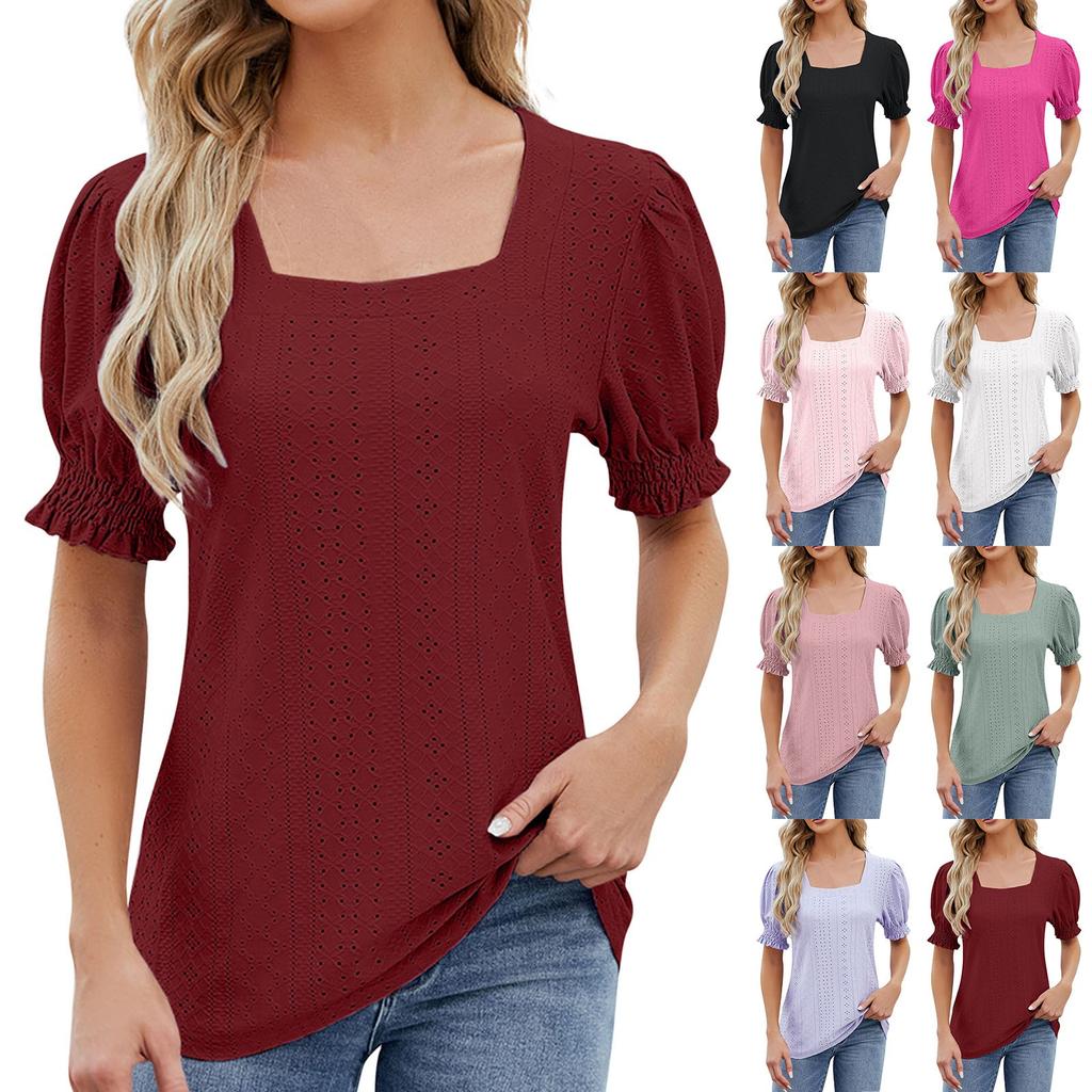 Damen Kurzarm Einfarbig Mode Eckiger Ausschnitt Puffärmel Locker T-Shirt Top