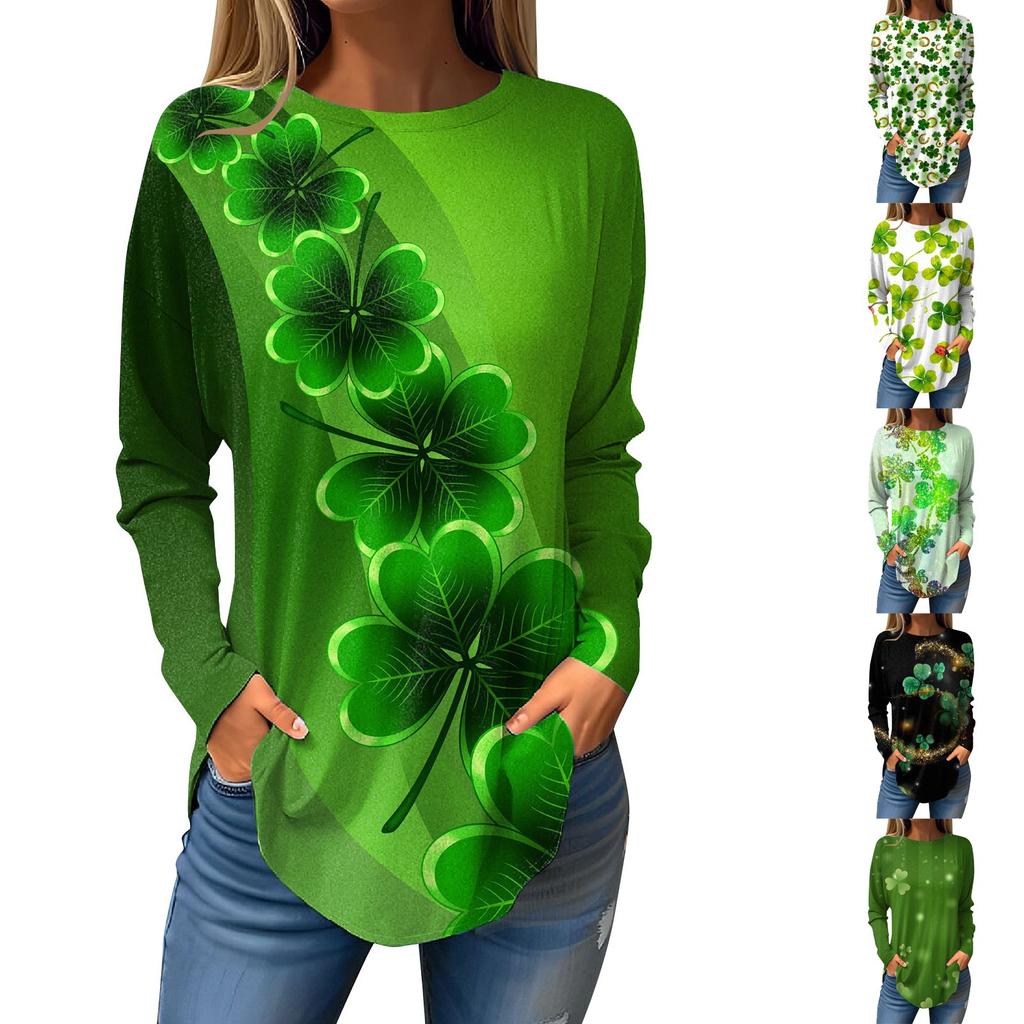 T-Shirts für Damen, Herbst, lässig, langärmelig, Sweatshirt, Retro-Druck, Top, Pullover, St. Patrick's Day