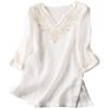 V-Ausschnitt-Shirt für Damen, exquisite handgefertigte, strapazierfähige Blumenstickerei, lockere Passform, mittellanger, gebogener Kragen, weißes T-Shirt mit 7-Zoll-Ärmeln