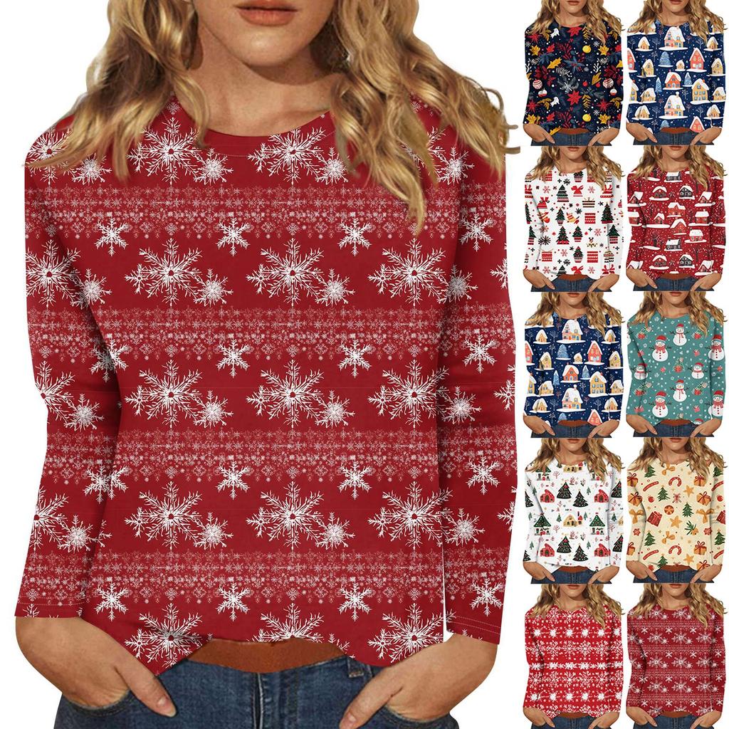 Damenmode Lässiges T-Shirt mit Weihnachtsdruck, Rundhalsausschnitt, lange Ärmel, dekoratives T-Shirt