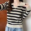 Striped Lapel Knitted Sweater Long Sleeved Autumn Slim Fit Versatile Fashion Color Blocked Outerwear Base Top