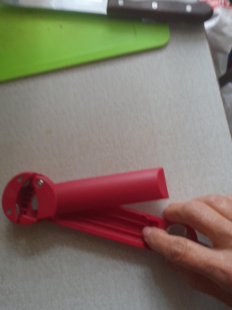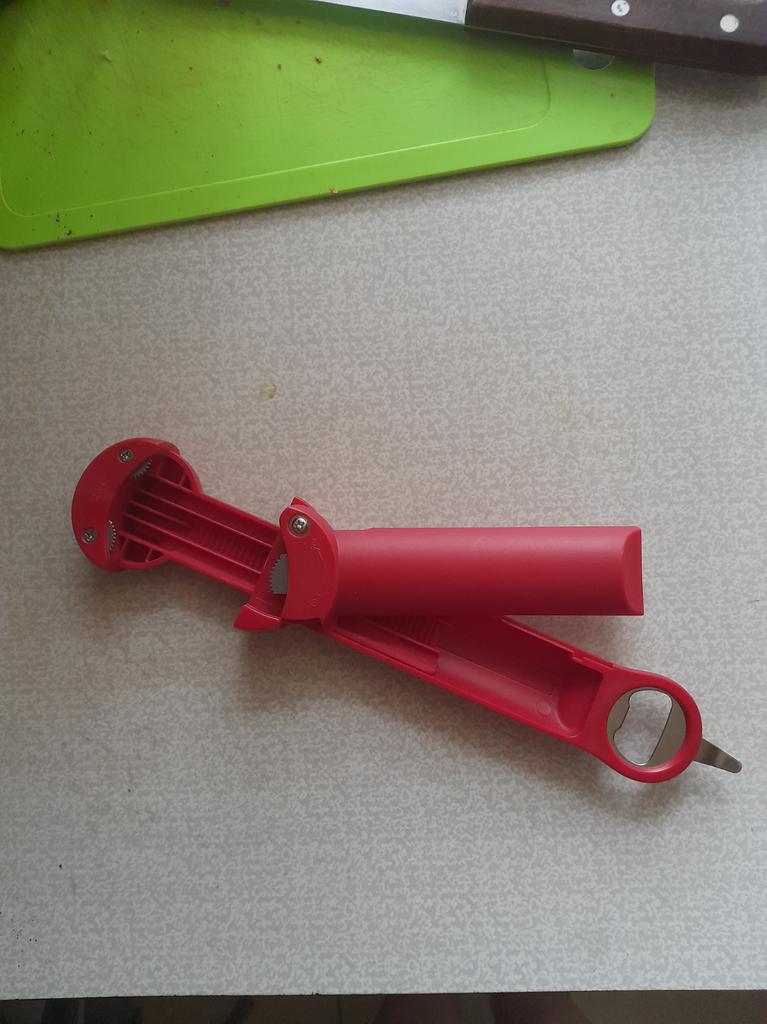 Für große Deckel ist sie etwas zu klein. Die Kontaktfläche der Zinken zum Deckel ist sehr klein. Und infolgedessen verformt sich der Deckel am Rand, die Zinken rutschen ab und verformen den Rand des Deckels einfach. Bei starkem Zudrehen verbiegt sich der Öffner einfach und es besteht überhaupt keine Möglichkeit, die Dose zu öffnen. Die Vorsprünge mit den Zinken sind sehr dünn. Dieser Öffner funktioniert nicht mit Deckeln mit großem Durchmesser.
