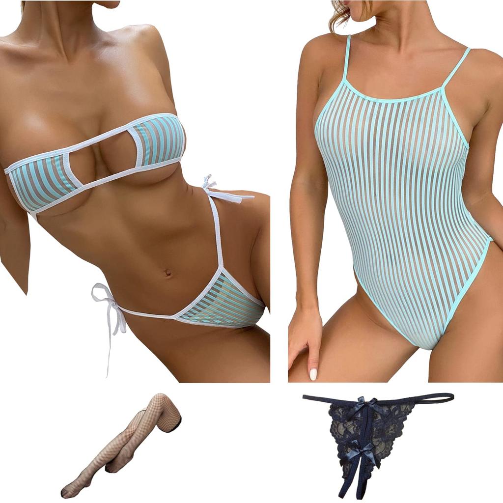 [Produktinhalt] Bikini-Oberteil und -Unterteil + Trikot + kniehohe Strümpfe + perforierte T-Back-Shorts = 5-teiliges Set [Größe (Bikini)] Einheitsgröße für Damen (entspricht S - 6L) Büste: ~130cm, Hüfte: ~160cm [Größe] (Trikot) )] Einheitsgröße für Damen (entspricht S - 3L) Hüften: ~110cm, Länge: ~70cm [Farbe] Himmelblau (Die Farbe und das Design von Strümpfen und Shorts werden Ihnen überlassen) [Eigenschaften] [Bikini] Ein Set aus Augenklappen-BH und T-Back-Shorts. Der Stoff mit Streifenmuster ist extrem dünn und hochtransparent. Durch die Verwendung von elastischen Bändern ist es für größere Größen und Herrenbekleidung geeignet. Den BH-Träger kannst du auf zwei Arten genießen: schulterfrei und um den Hals. [Turnanzug] Super sexy hochgeschnittener Turnanzug-Unterwäsche mit einem transparenten Streifenmuster. Aus ultradünnem Stoff mit hoher Elastizität gefertigt, kann es auch in großen Größen untergebracht werden.. *Wir haben auch eine große Auswahl an anderen Artikeln im Angebot, darunter Zimmerkleider, Babydolls, Turnanzüge, Mikrobikinis und Mutanga. [Vorsichtsmaßnahmen für die Verwendung] Wir empfehlen, vorsichtig mit der Hand in lauwarmem Wasser zu waschen und im Haus zu trocknen. Farbige Artikel verblassen, daher sollten Sie sie nicht zusammen mit weißen Artikeln kaufen.. auf Kleidung geklebte Accessoires