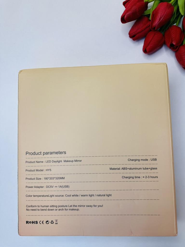 TEWIRROW LED-Schminkspiegel 8 Zoll Wenn Sie auf der Suche nach einem Schminkspiegel mit individueller Beleuchtung sind, der jedes Pflegeerlebnis komfortabler und beeindruckender macht, ist der LED-Schminkspiegel von TEWIRROW die perfekte Lösung. Mit einem funktionalen Design, einstellbarer Beleuchtung und einem wiederaufladbaren Akku ist dies ein Produkt, das Ihr tägliches Make-up- und Pflegeerlebnis verbessern kann. * Der Spiegel verfügt über 3 Beleuchtungsmodi (weißes Licht, warmes Licht und kaltes Licht), sodass Sie für jede Situation das am besten geeignete Licht auswählen können. Darüber hinaus besteht die Möglichkeit, die Helligkeit des Lichts je nach Bedarf anzupassen. - Der Spiegel speichert die Helligkeit des Lichts, die Sie nach der vorherigen Verwendung eingestellt haben, sodass das Licht bei der nächsten erneuten Verwendung genau so ist, wie Sie es verlassen haben. - Mit einem internen 1200-mAh-Akku ist der Spiegel wiederaufladbar und ermöglicht eine kabellose Nutzung für bis zu einer Woche mit einer Ladung. Sie müssen nicht ständig die Batterien wechseln. - Der Spiegel lässt sich leicht drehen, sodass Sie für jeden Bedarf den perfekten Winkel finden – sei es für Make-up oder das Frisieren von Haaren. - Der Spiegel besteht aus einem hochwertigen ABS-Rahmen mit glänzender Oberfläche, die jedem Raum oder Wohnzimmer einen Hauch von Luxus verleiht. Sie sieht in jeder Umgebung großartig aus. - Produktmaterial: ABS-Rahmen + Aluminiumrohr + Glas - Modi: weißes Licht, warmes Licht, kaltes Licht - Produktgröße: 180 * 203 * 320 mm - Ladezeit 2-3 Stunden. was im Paket enthalten ist - LED-Spiegel mit Ständer x 1 - USB-Kabel x 1 - Benutzerhandbuch in verschiedenen Sprachen (Englisch, Französisch, Deutsch, Italienisch, Spanisch, Japanisch) --- Dieser LED-Spiegel bietet alles, was Sie brauchen, um den täglichen Make-up-Prozess zu erleichtern, ist bequem zu bedienen und sorgt in jedem Winkel für eine hervorragende Beleuchtung. Es ist sowohl praktisch als auch schön und macht jeden Moment der Pflege angenehm und eindrucksvoll. Genießen Sie die lange, einfache und komfortable Nutzung dieses beleuchteten Spiegels!