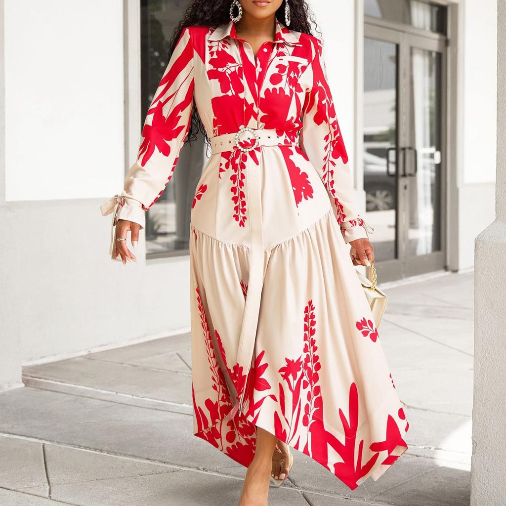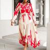 YYFS Damenmode Frühling Herbst Blumenmuster Druck Langarm Polokragen Hohe Taille Freizeitkleider