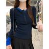 Süßes heißes Mädchen blaue Kontrastnähte Fake zweiteiliges langärmeliges T-Shirt für Damen im Herbst Unterhemd mit Rundhalsausschnitt rechtes Schulteroberteil