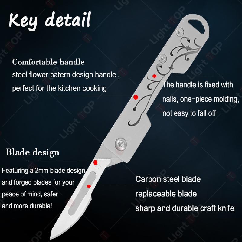 Stainless Steel Mini Pocket Knife Floral Pattern Handle Open Scalpel Knife Replaceable Blades Multifunctional Kitchen Knives