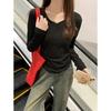 Unregelmäßiger Saum, rechte Schulter, V-Ausschnitt, langärmeliges T-Shirt für Damen im Herbst, taillenförmige plissierte Innenschicht, atemberaubendes Baselayer-Top