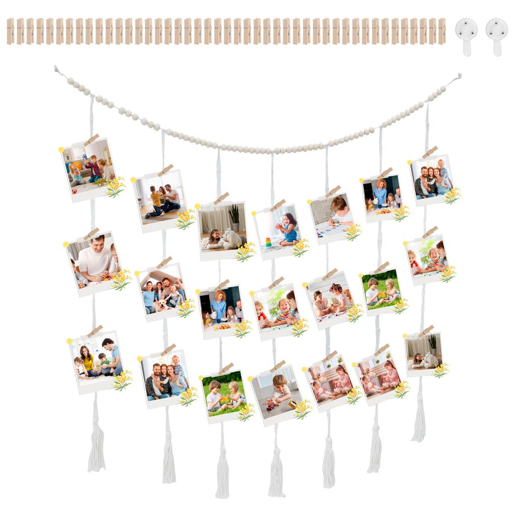 Wandbehang-Fotodisplay mit 45 Clips, dekorativer Collage-Bilderrahmen, DIY-Fotoschnur mit Holzperlen-Girlande für Schlafzimmer