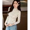 Woll- und Fleece-T-Shirt Damen Floral Herbst und Winter Neu Langarm-Oberteil Hoher Halsausschnitt Basis-Shirt
