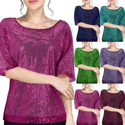 Einfarbiges, mit Pailletten besetztes, rundhalsförmiges, lockeres, lässiges T-Shirt mit kurzen Ärmeln für Damen