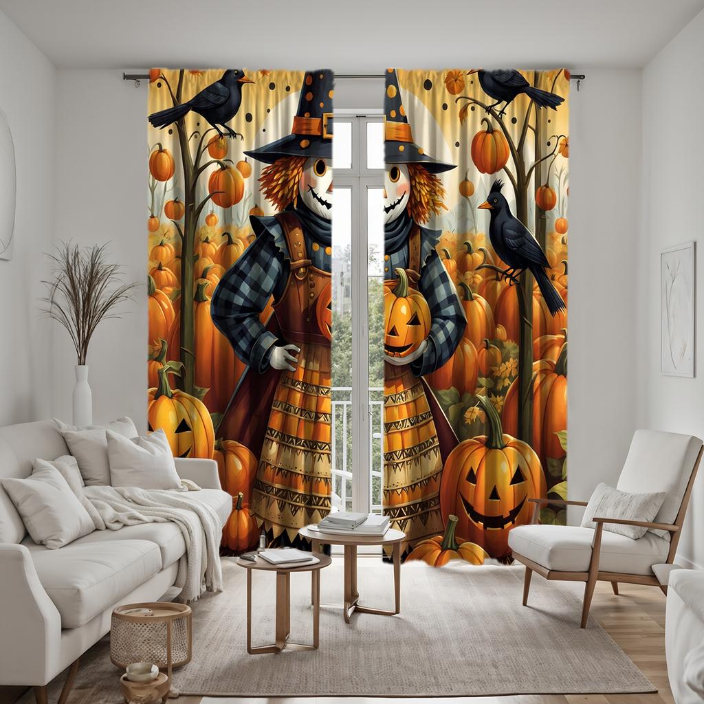 2er-Set HD Halloween Kürbisfeld Vogelscheuche Dekorative Vorhänge Gelbe Krawatte Digital bedruckte Vorhänge Heimdekorationsstil Dez