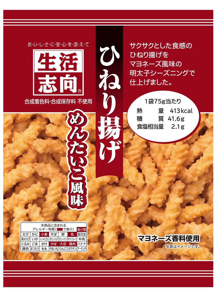 Zutaten: Teig (Weizenmehl, Maisstärke, Salz) (hergestellt in Japan), Pflanzenöl, Mentaiko-Artige Würzmischung [Laktose, Zucker, Salz, Glukose, Gewürze, Bonito-Extraktpulver, Jakobsmuschel-Extrakt] Pulver, Hefeextraktpulver, Fischsaucenpulver (Meeresfrüchte), Proteinhydrolysat, Fischöl], Mentaiko-Mayonnaise-Stil-Würze (Zucker, Salz, Vollmilchpulver, Öl- und Fettpulver, Essigpulver, Meeresfrüchteextrakt) Pulver, Lebensmittel, deren Hauptzutaten Milch usw. sind, Gewürze, Proteinhydrolysate, Mentaiko-Pulver, Reiskeimöl)/Gewürze (Aminosäuren usw.), Triebmittel, Aromen, Säuerungsmittel, Gewürzextrakte, Farbstoffe (Rote Bete) Süßstoff (Stevia), Antioxidans (Rosmarinextrakt), (Einige Zutaten enthalten Weizen, Milchbestandteile, Makrele, Sojabohnen, Hühnchen, Fischsaucenpulver (Meeresfrüchte)) einschließlich)