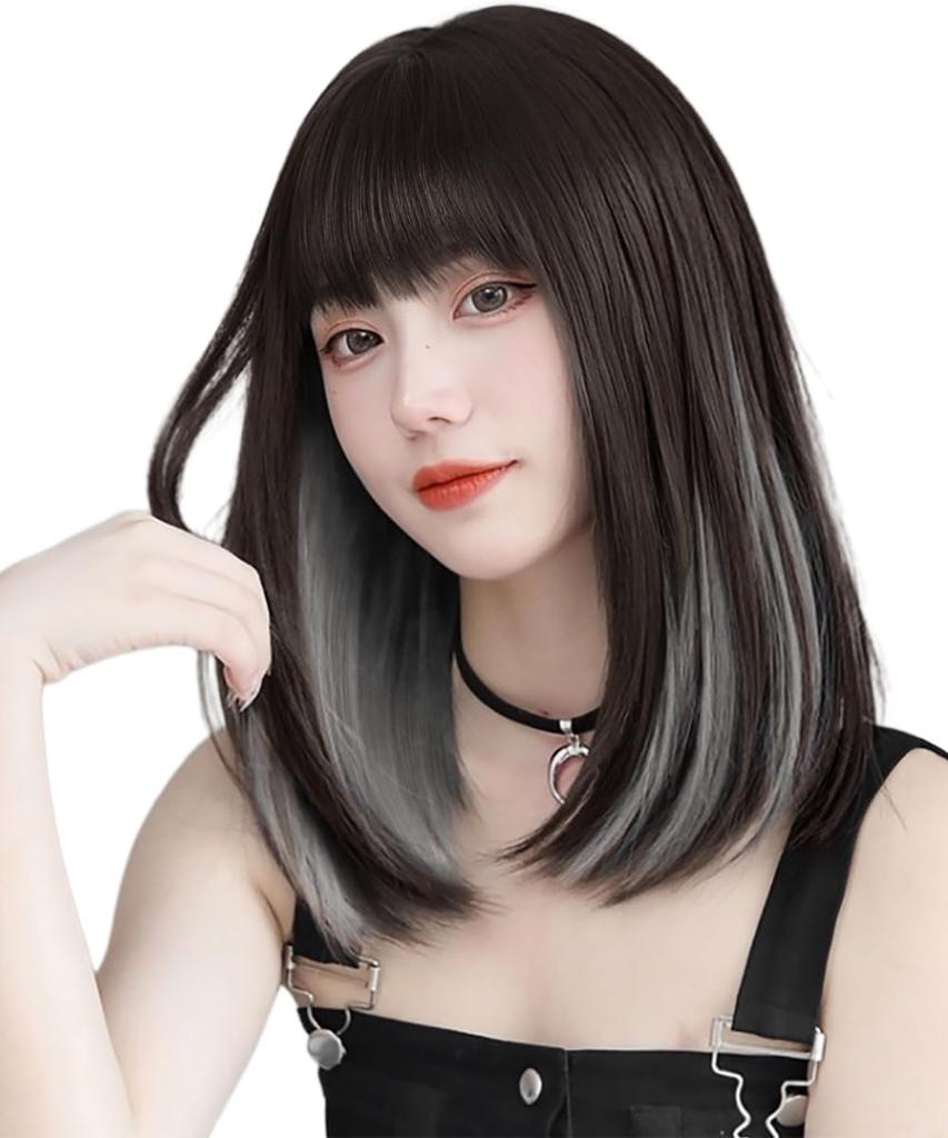 AISIQUEENS Perücke Schwarz Mittel Innenfarbe Grau Volle Perücke Natürlich Mode Stilvoll Alltagsperücke Cosplay Glatt mit Netz Halblang Damen
