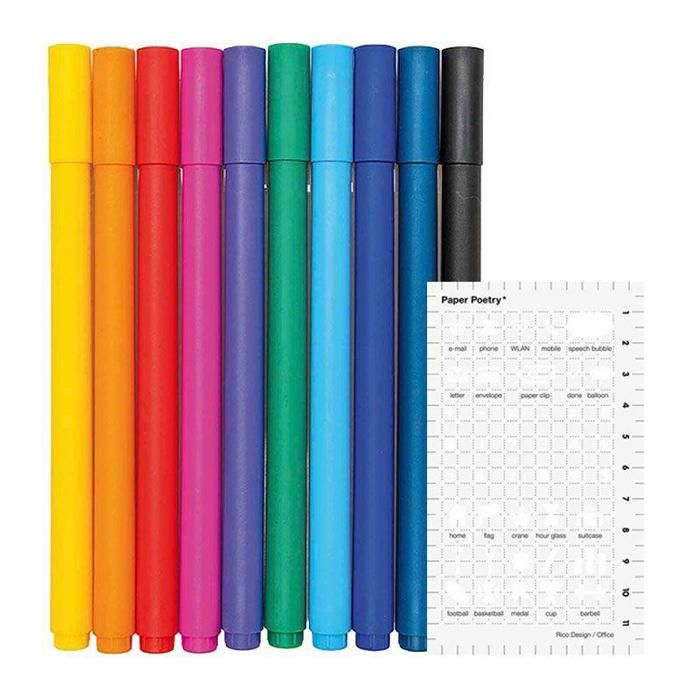 10 stylos gel fin 0,4 mm + Pochoir icônes bureau