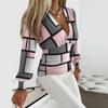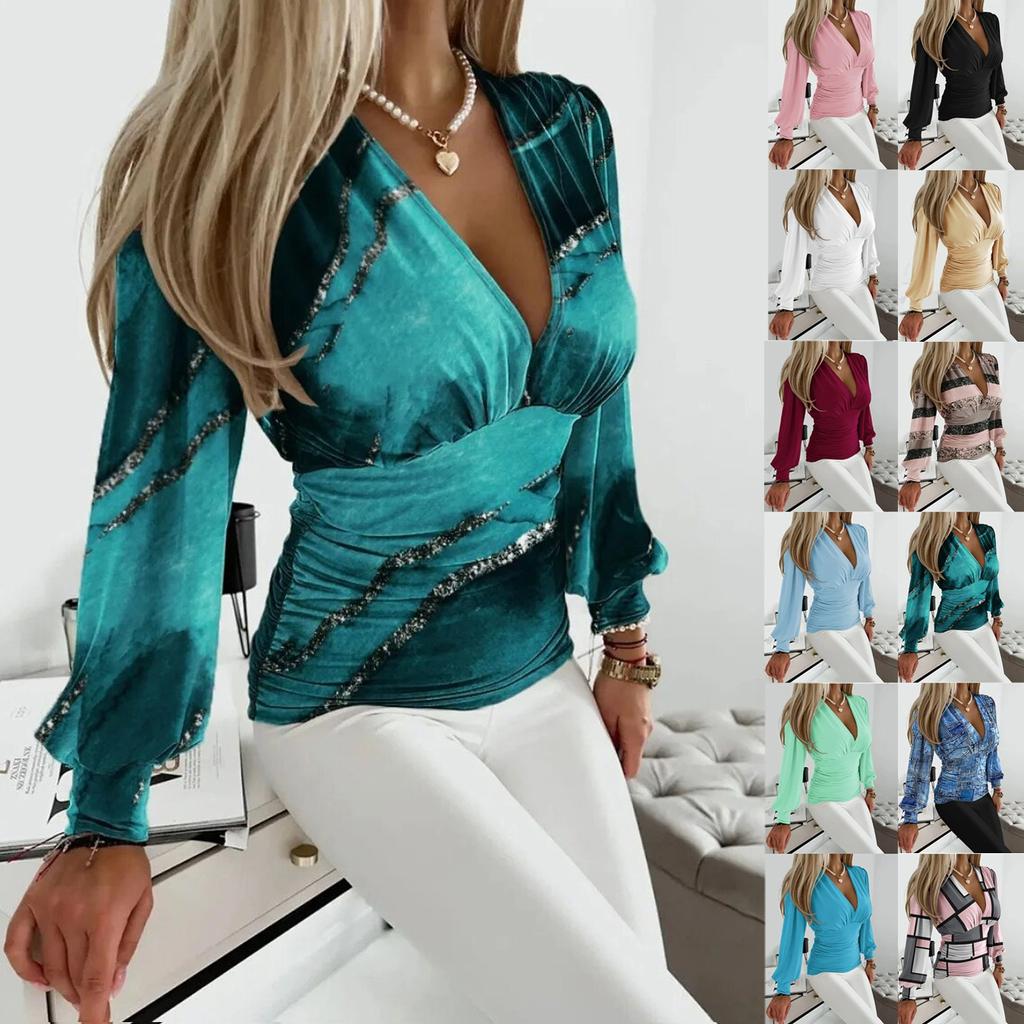 Langarmshirt für Damen, modisches T-Shirt mit V-Ausschnitt und Retro-Print in der Taille