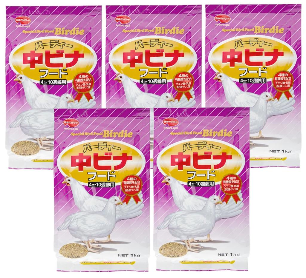 Ein Set mit 5 Stück „Birdie Medium Vina Food 1kg“, ein Futter, das für mittelgroße Vinas im Alter von 4 bis 10 Wochen geeignet ist.
