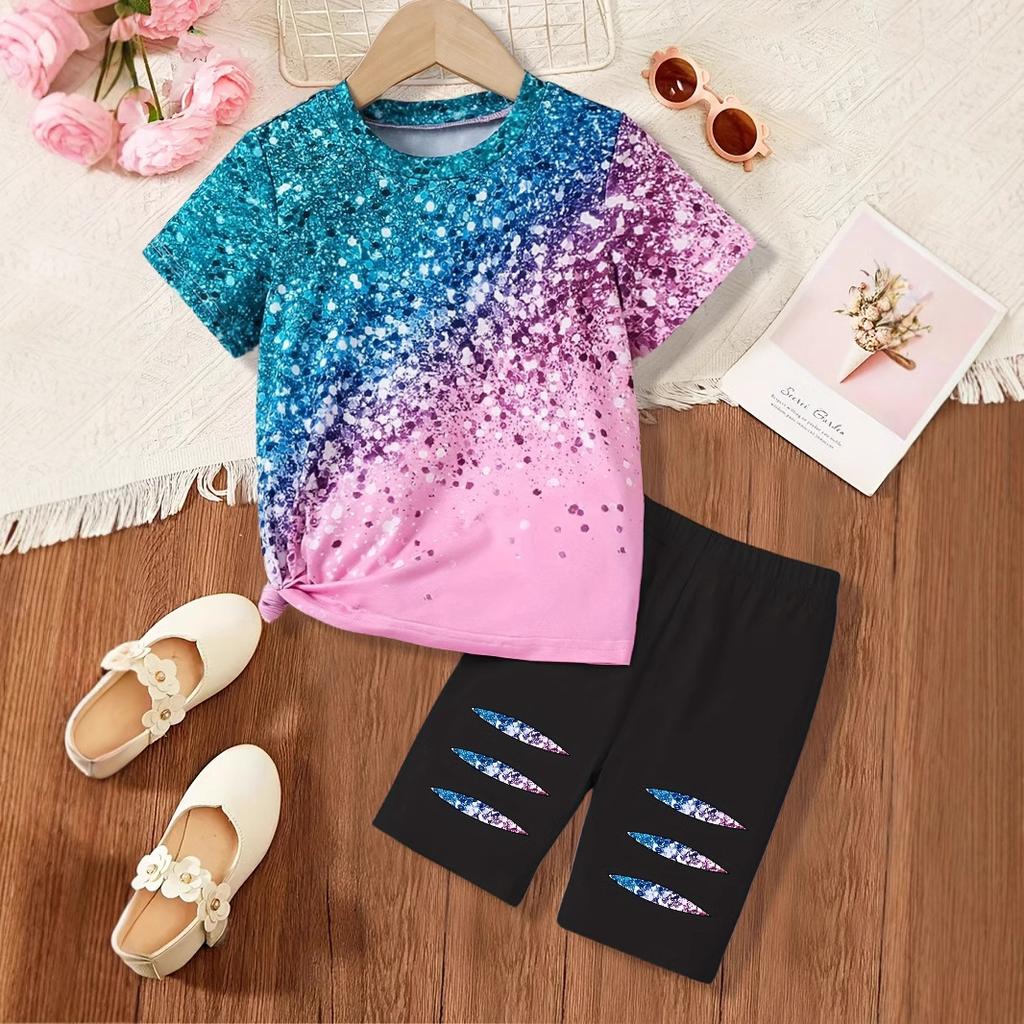 Mädchen Glitzer Party Pailletten Bedruckt Rundhals Kurzarm 2-teiliger Sommer Kinder Freizeitanzug