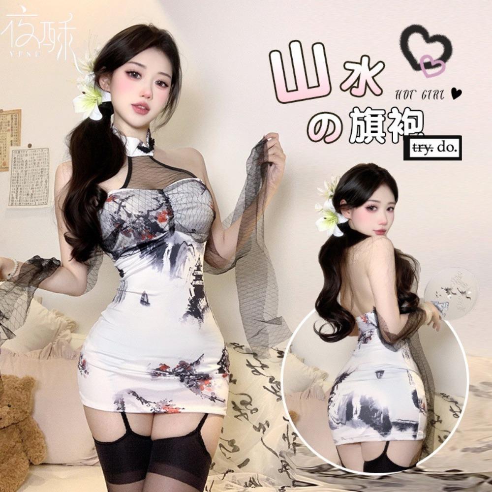 Night Crisp Sexy Underwear, Newly Improved Printed Landscape Cheongsam, Backless Slim Slit Hip Skirt, Chinese Style National Style Nightdress