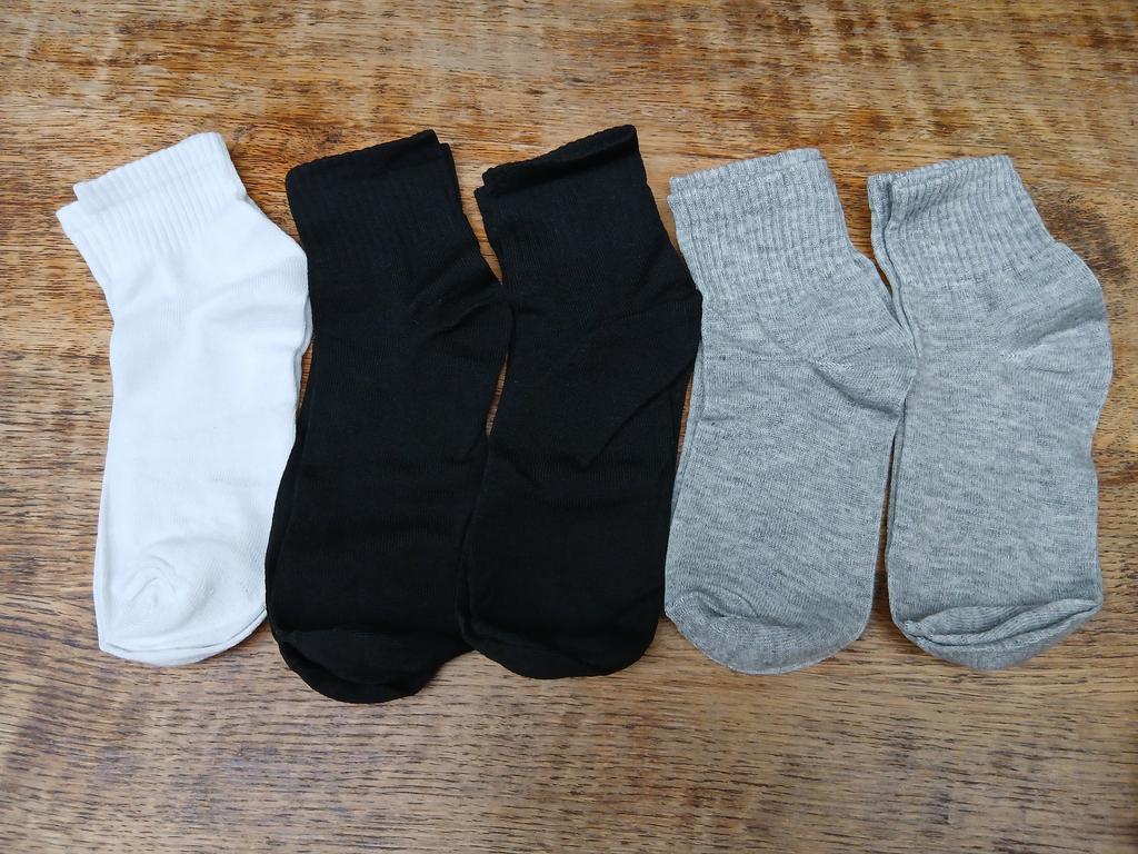 Satz Socken Das Set enthält 5 Paar, Sie können entweder eine Farbe (weiß, grau, schwarz) oder verschiedene Farben wie meine wählen: 2 Paar schwarz, 2 Paar grau und 1 Paar weiß. Die Socken sind weich, dünn, eine tolle Option für Frühling und Sommer. Die Stoffzusammensetzung besteht aus Baumwolle mit einem Zusatz von Polyester auf der Haut.. Bei einer Fußlänge von 25 cm passen sie gut. Kam in Post- und Klarsichtverpackungen an, ohne Fremdgeruch. Ich empfehle den Kauf von Socken.