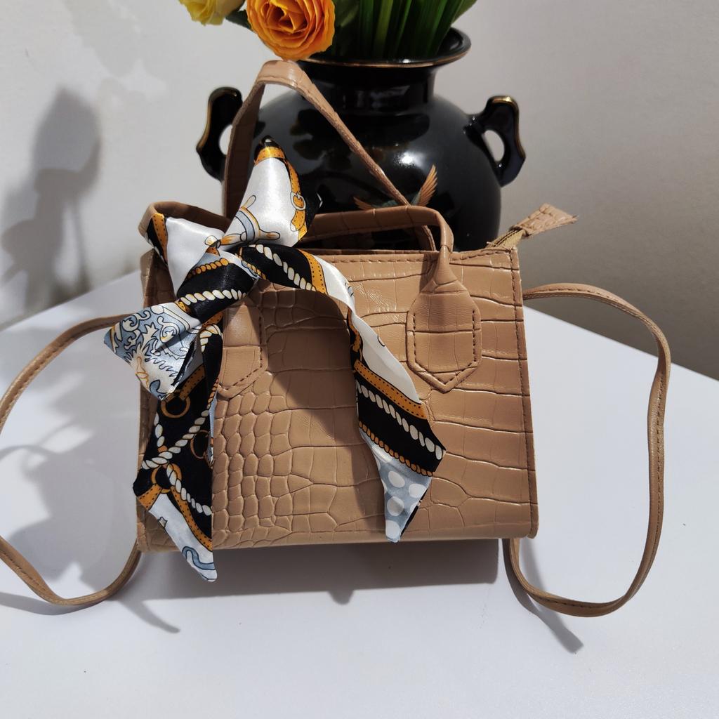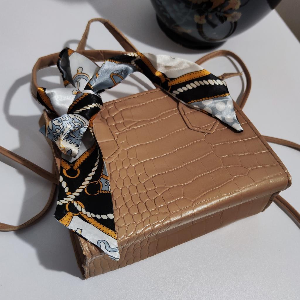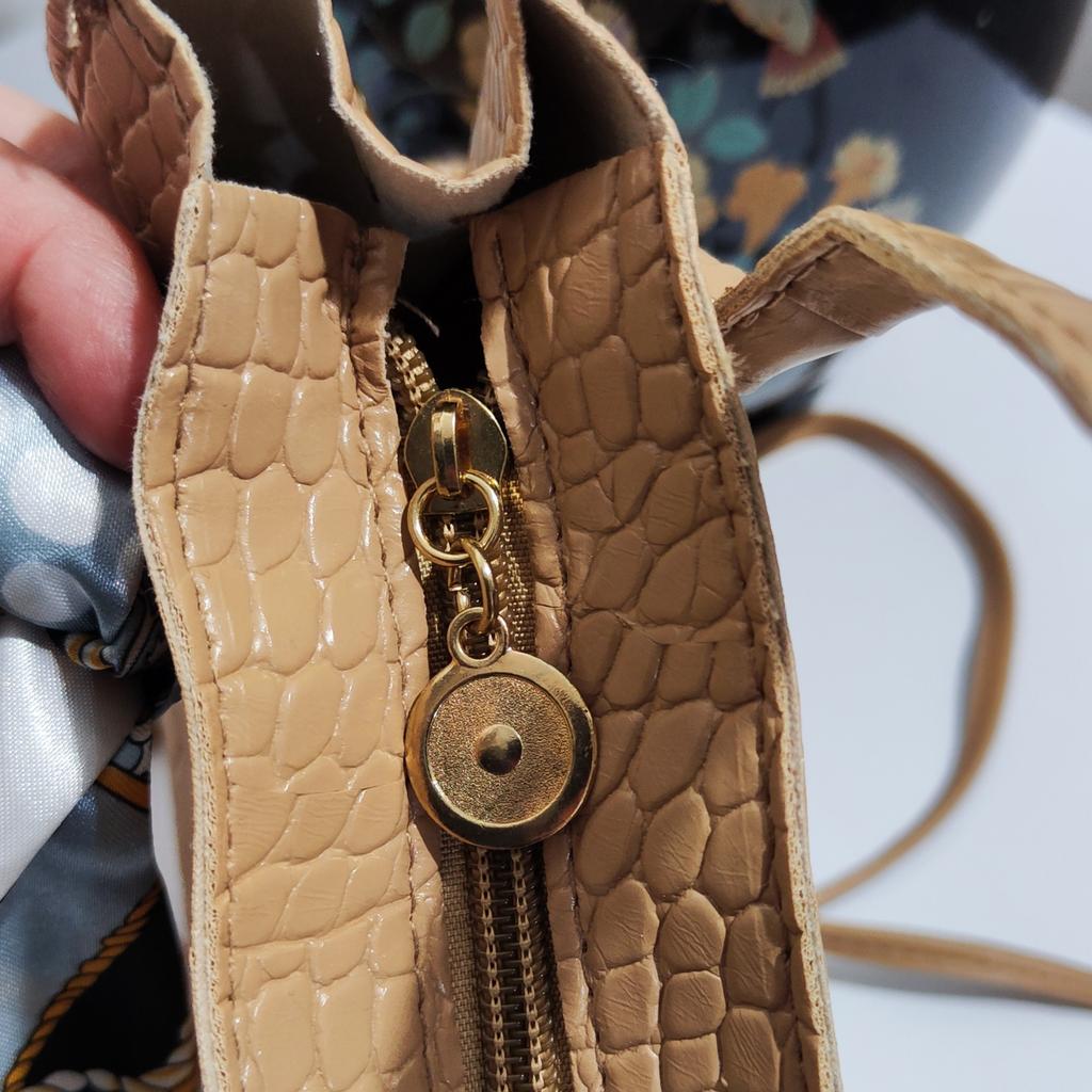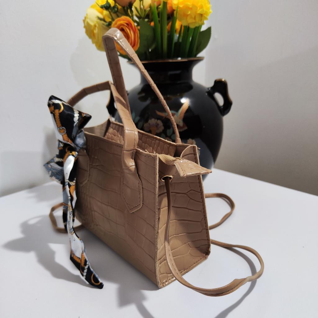 Diese stilvolle Umhängetasche im Tote-Stil zeichnet sich durch ein elegantes Retro-Design aus. Die Außenseite besteht aus einem hochwertigen Strukturstoff mit geprägtem Krokodilmuster, das ihm ein luxuriöses und hochwertiges Aussehen verleiht.. Es ist in einem sanften Beigeton erhältlich (auch in weiß, rosa und schwarz erhältlich), strahlt ein Gefühl von Raffinesse aus. Ein farbenfroher Seidenschal ist kunstvoll um den Griff gebunden und verleiht ihm einen Hauch von Charme und einen Farbtupfer. Die Tasche hat eine strukturierte Form mit klaren Linien und einem goldfarbenen Reißverschluss für ein edles Finish.